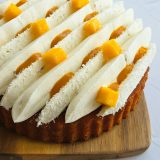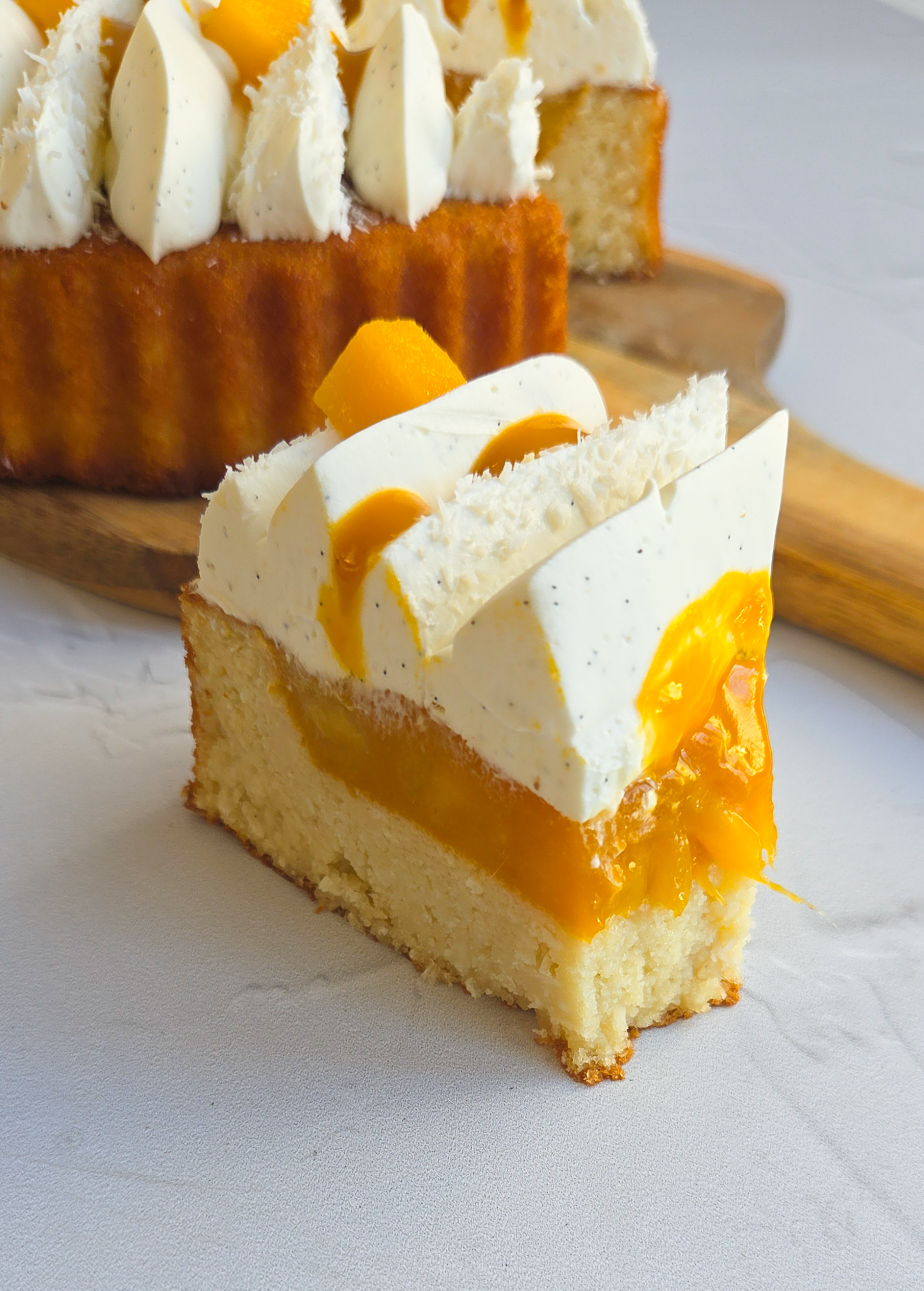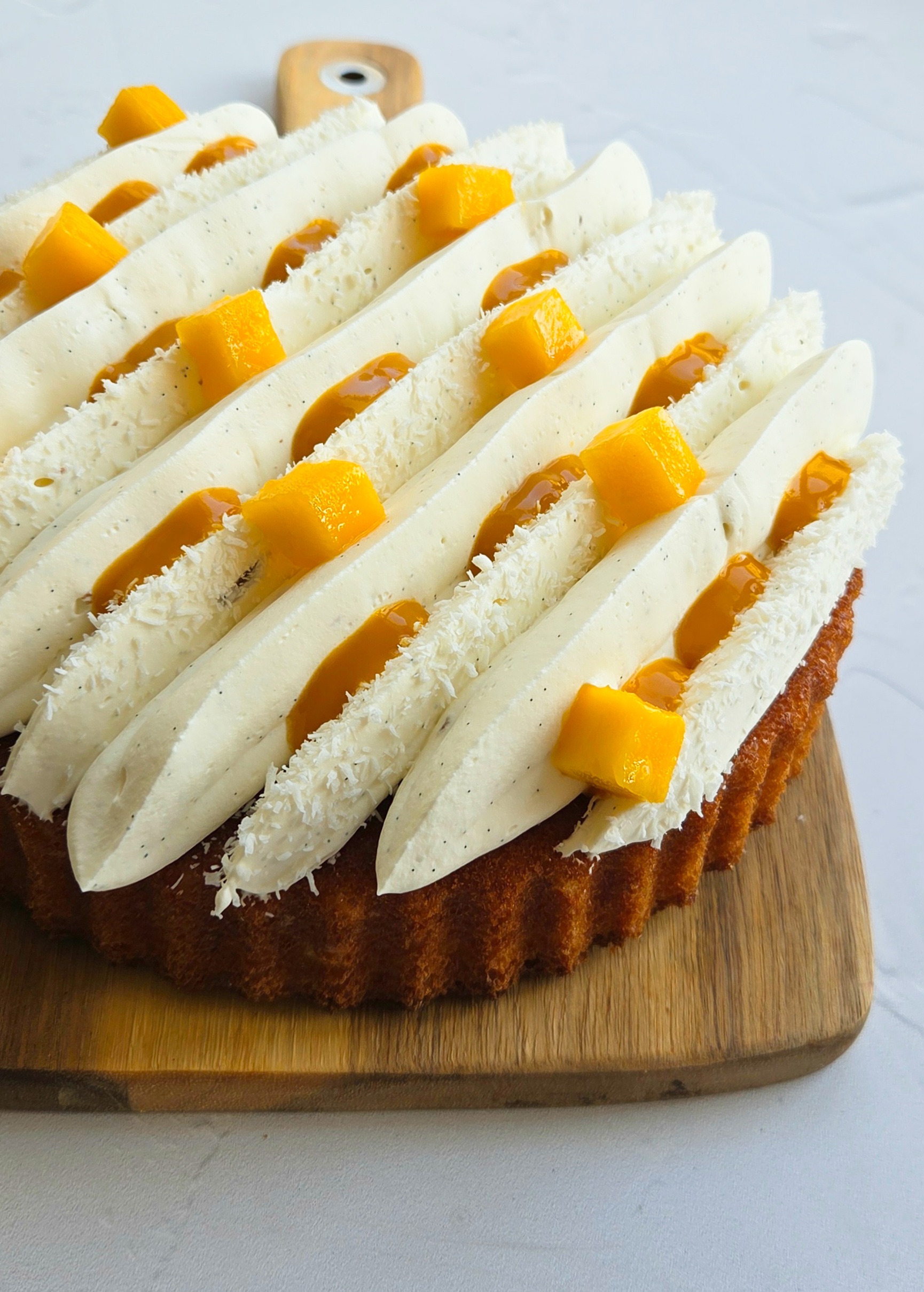 Sur une base de biscuit coco, se cache un cœur fondant de mangue, accompagné de la douceur d’une ganache montée à la vanille.